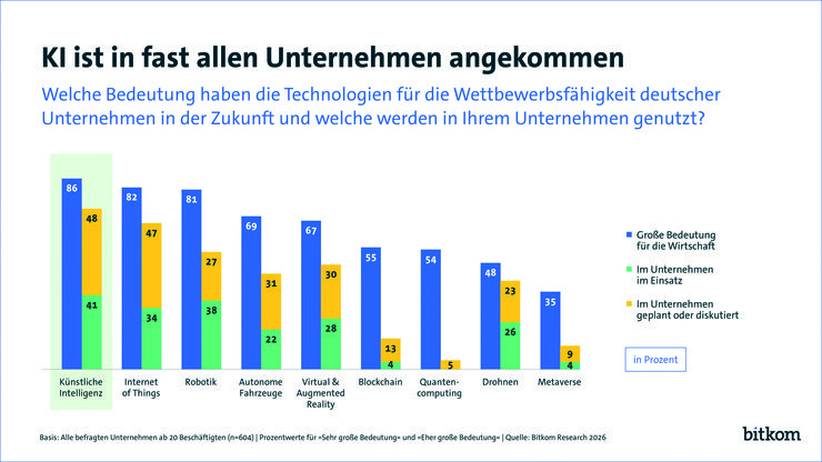Künstliche Intelligenz entwickelt sich zum wichtigsten Treiber der Digitalisierung in der deutschen Wirtschaft. Inzwischen nutzen 41 Prozent der Unternehmen ab 20 Beschäftigten KI, weitere 48 Prozent planen oder diskutieren den Einsatz. Vor einem Jahr hatten erst 17 Prozent KI im Einsatz, 40 Prozent waren in der Diskussionsphase. Für drei Viertel (77 Prozent) der Unternehmen, die derzeit KI einsetzen, hat sich dadurch ihre Wettbewerbsposition verbessert. 52 Prozent berichten von einem messbaren Beitrag von KI für ihren Unternehmenserfolg und zwei Drittel (66 Prozent) wollen den KI-Einsatz weiter ausbauen. Das sind Ergebnisse einer repräsentativen Befragung von 604 Unternehmen ab 20 Beschäftigten in Deutschland im Auftrag des Digitalverbands Bitkom. „Künstliche Intelligenz ist weltweit der entscheidende Treiber für mehr Produktivität und Effizienz. Die deutsche Wirtschaft macht beim KI-Einsatz Tempo“, sagt Bitkom-Präsident Dr. Ralf Wintergerst. „Bei KI geht es nicht nur darum, wer das beste Sprachmodell baut, es geht um den Einsatz überall dort, wo Deutschlands Wirtschaft stark ist, etwa in der Industrie, in der Pharmazie oder in der Medizintechnik.“